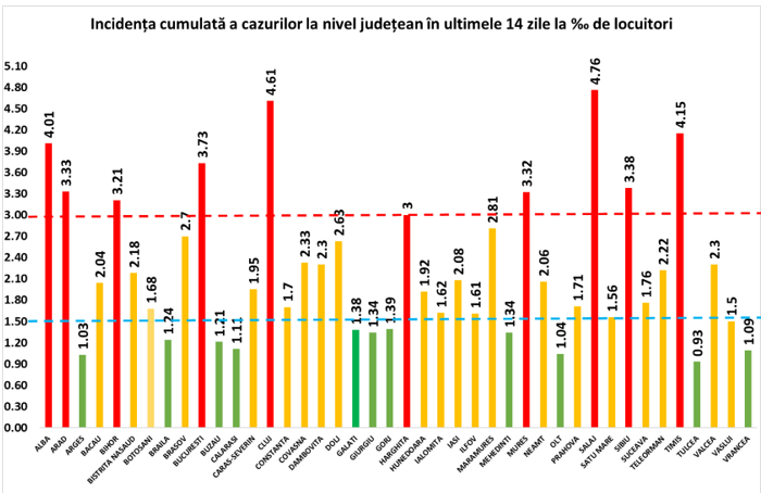 Coeficientul infectărilor cumulate la 14 zile, raportate la 1.000 de locuitori este calculat de către Direcțiile de Sănătate Publică, la nivelul Municipiului București și al județelor. Mai jos aveți graficul realizat în baza raportărilor primite de CNCCI de la Direcțiile de Sănătate Publică: