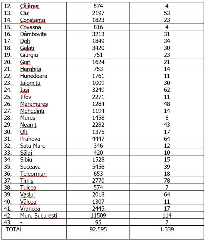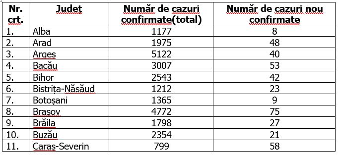 În urma testelor efectuate la nivel național, față de ultima raportare, au fost înregistrate 1.339 de cazuri noi de persoane infectate cu SARS-CoV-2 (COVID-19), acestea fiind cazuri care nu au mai avut anterior un test pozitiv. Distribuția pe județe a cazurilor per total și a celor noi o regăsiți în tabelul de mai jos.