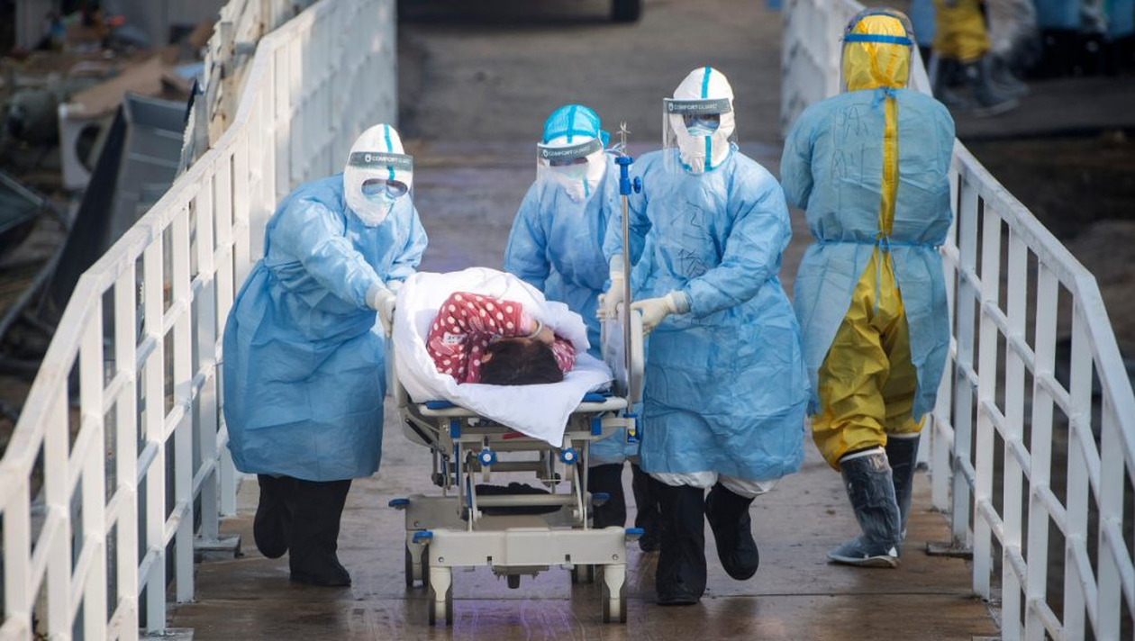In this photo released by China's Xinhua News Agency, medical workers in protective suits help transfer the first group of patients into the newly-completed Huoshenshan temporary field hospital in Wuhan in central China's Hubei province. China said Tuesday the number of infections from a new virus surpassed 20,000 as medical workers and patients arrived at a new hospital and President Xi Jinping said "we have launched a people's war of prevention of the epidemic." (Xiao Yijiu/Xinhua via AP)