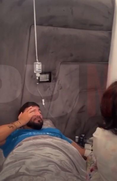 În mediul online au apărut primele imagini cu manelistul care, lipsit de vlagă, era întins în pat, iar o femeie îi aranja perfuzia, pe care o avea introdusă în brațul stâng.
