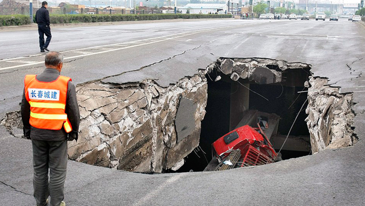 Probabil ca si politistul a ramas mut in fata unei gropi imense, pe unul dintre drumurile din orasul Changchun, China. Un camion a fost „inghitit” in totalitate de o „gaura neagra” in asfalt. In autocamionul avariat se aflau doua persoane care au fost ranite si au avut nevoie de ingrijiri medicale. Se pare ca masina cara tevi de otel si era mult prea incarcata pentru drumul respectiv. China este una dintre cele mai periculoase tari din punct de vedere al sofatului.