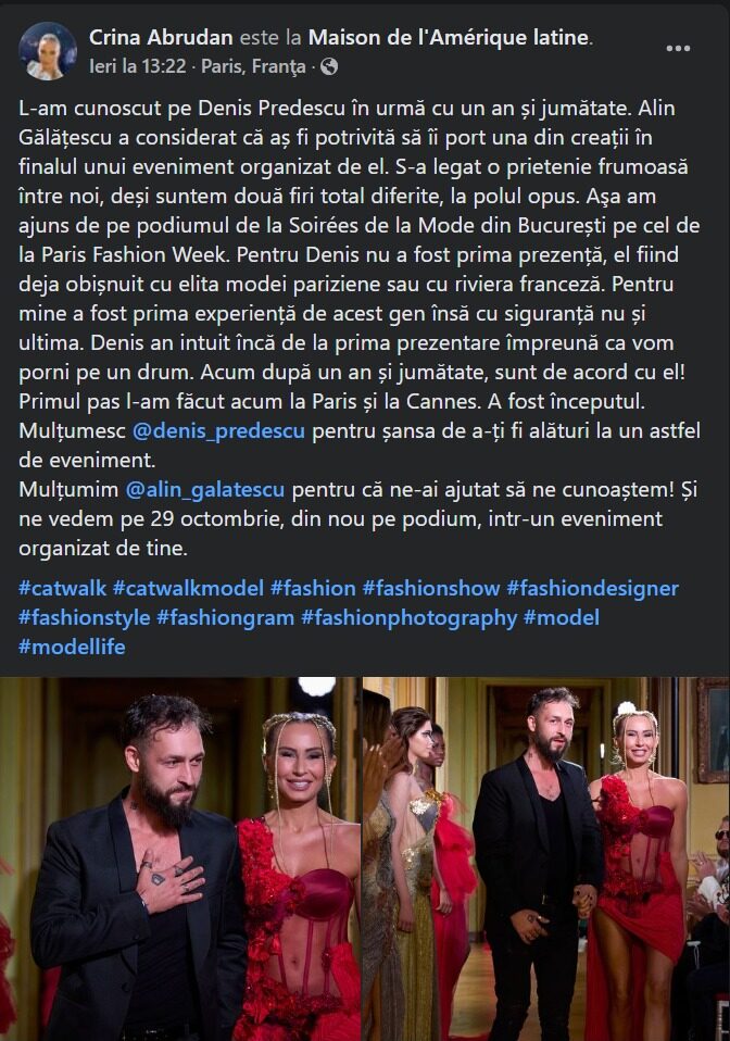 Crina Abrudan s-a afișat la brațul altui bărbat chipeș! Nu, nu este vorba despre un divorț de Gabi Popescu și o nouă relație. Fosta Prezentatoare TV a fost modelul desginerului Denis Predescu și a transmis un mesaj de mulțumire tuturor celor care au ajutat-o și au crezut în ea.