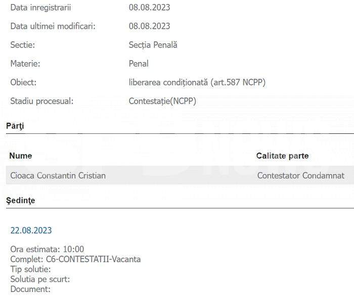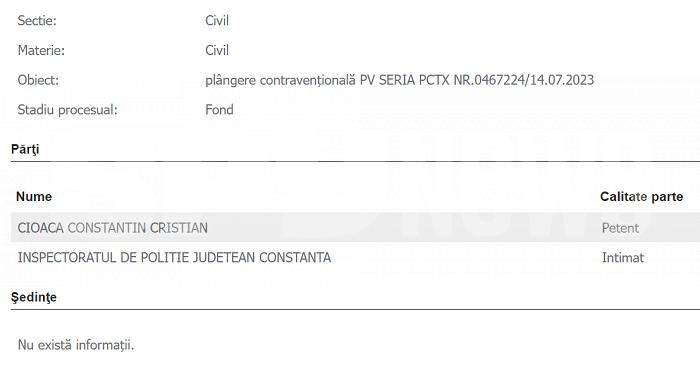 Conform informațiilor publice de pe portalul instanțelor de judecată, Cristian Cioacă a deschis un proces la Mangalia, unde a solicitat anularea unei sancțiuni contravenționale pe care ar fi primit-o la malul mării, pe data de 14 iulie.