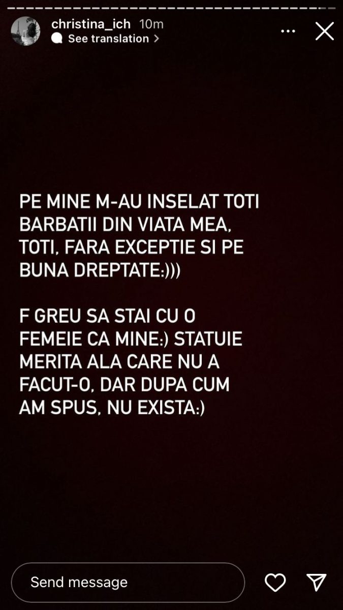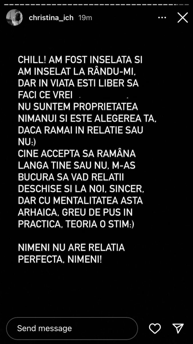 ”Am fost înșelată și am înșelat, la rându-mi, dar în viață ești liber să faci ce vrei, nu suntem proprietatea nimănui și este alegerea ta dacă rămâi în relație sau nu. Cine accesptă să rămână șângă tine sau nu, m-as bucura sa vad relații deschise și la noi, sincer. Dar cu mentalitatea asta arhaică, greu de pus în practică, teoria o știm. Nimeni nu are relația perfectă, nimeni! Pe mine m-au înșelat toți bărbații din viața mea, fără excepție și pe bună dreptate. :)) Foarte greu să stai cu o femeie ca mine. Statuie merită ăla care nu a făcut-o, dar cum am spus, nu există!”, a scris Cristina pe Instagram.