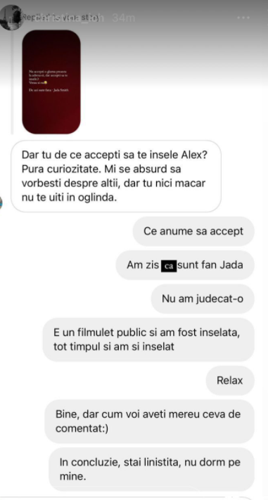 ”Nu accepți o glumă proastă la adresa ei, dar accepți să te înșele. Vreau și eu. De azi sunt fana Jada Smith”, a scris Cristina Ich pe Instatory. (făcând referire, cel mai probabil, la faptul că Jada și Will Smith au declrat în nenumărate rânduri că au o căsnicie deschisă și au relații cu alte persoane).