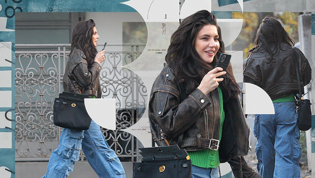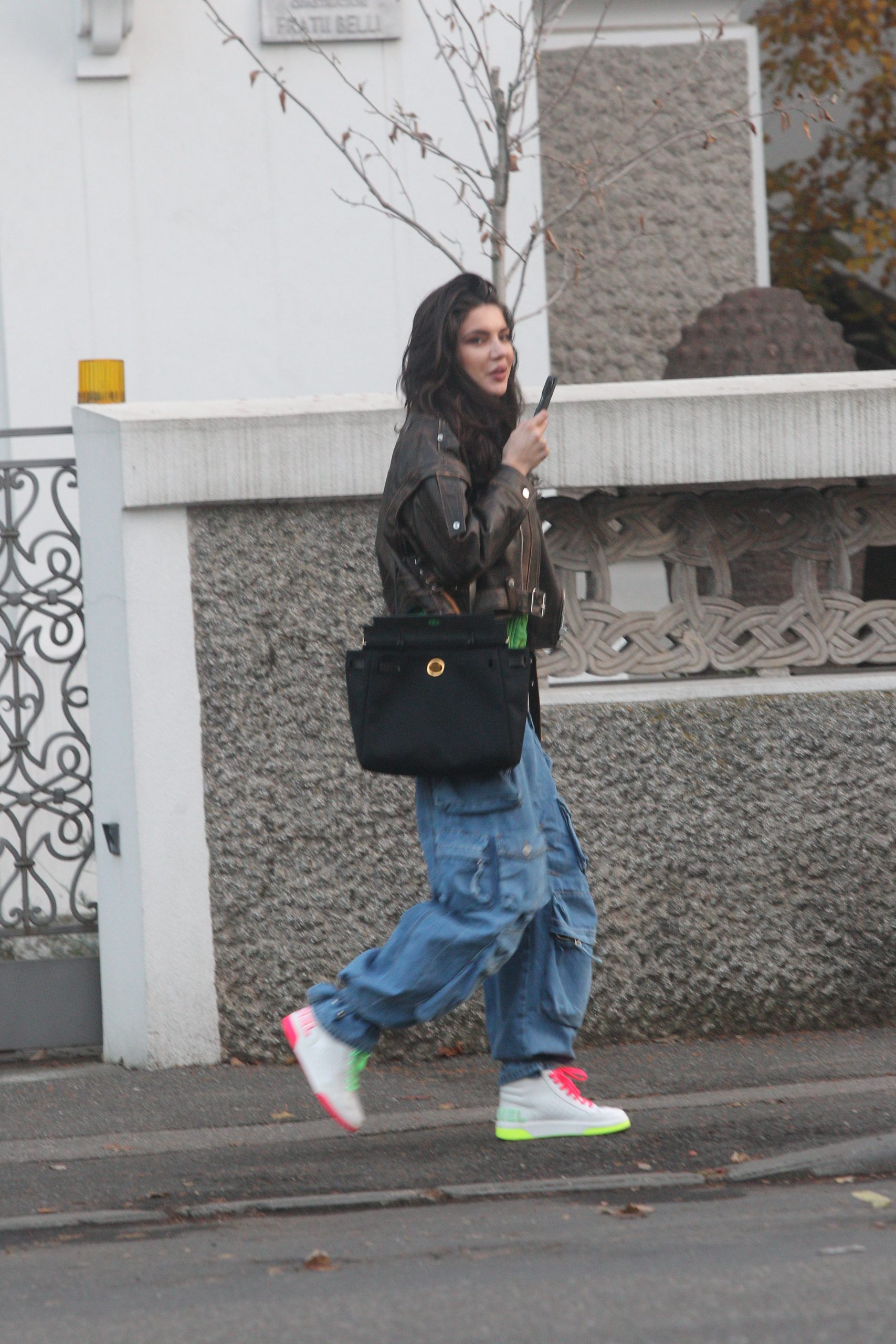 Outfit-ul ales de șatenă a fost compus dintr-o pereche de jeanși “The Attico”, albaștri, largi, dar care i-au încadrat perfect talia subțirică, de aproape 700 de euro, o pereche de sneakersi Chanel 2020 Cruise bi-color, o geacă de piele vintage și o geantă neagră, simplă.