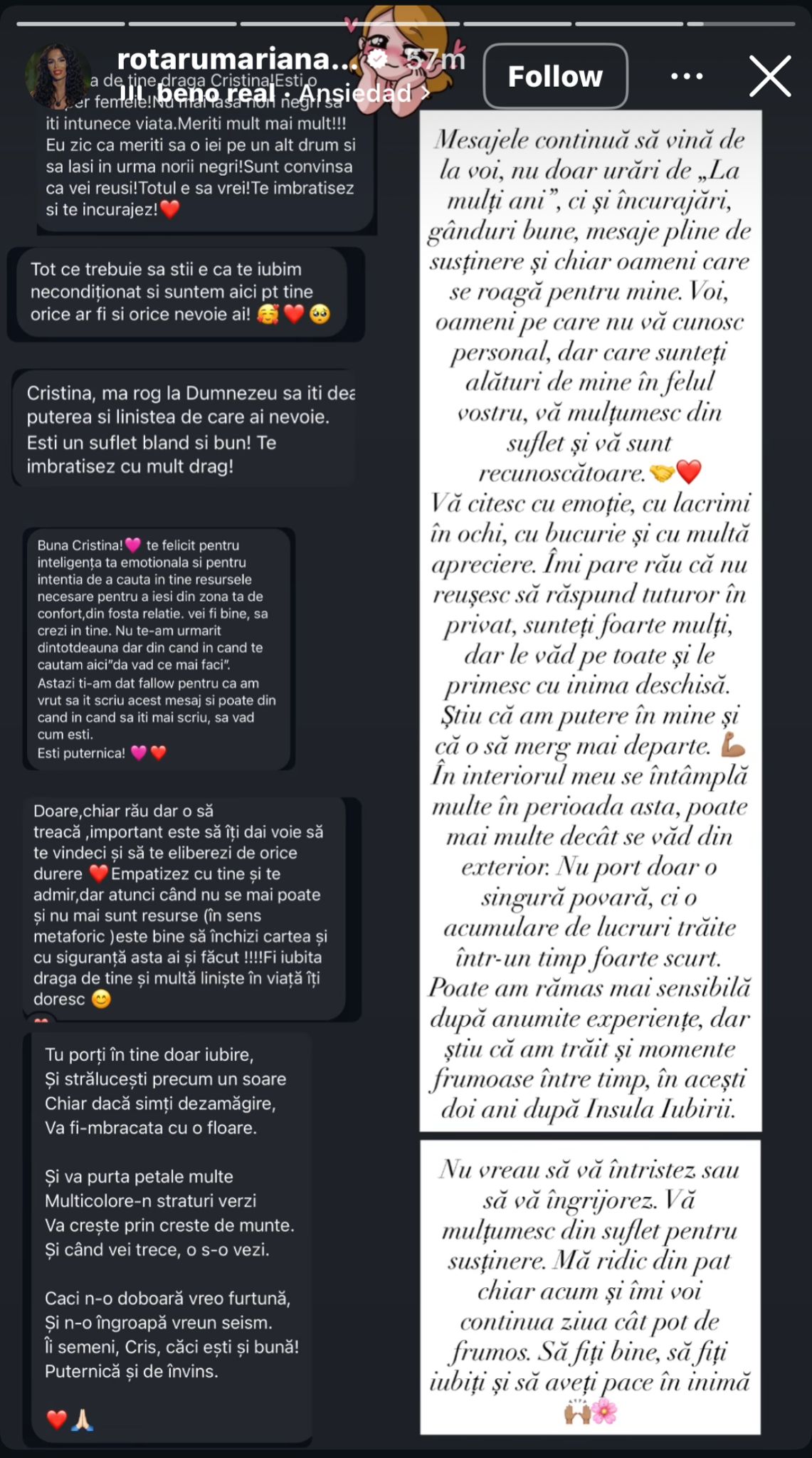 „Zilele astea mă odihnesc acasă la ea. Nu mă simt în stare să stau singură. Știu că am putere în mine și si să merg mai departe. În interiorul meu se întâmplă multe, perioada asta, poate mai multe decât se văd din exterior. Nu port doar o singură povară, ci o acumulare de lucruri trăite într-un timp foarte scurt. Poate am rămas mai sensibilă după anumite experiențe, dar știu că am trăit și momente frumoase între timp, în acești doi ani după Insula Iubirii”, a transmis Cristina Petre, pe Instagram.