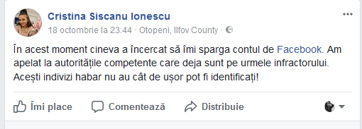 Ulterior, Cristina a ajuns la poliţie penru a înregistra la plângere. ,,În acest moment, cineva a încercat să îmi spargă contul de Facebook. Am apelat la autorităţile competenţe care sunt deja pe urmele infractorului. Aceşti indivizi habar nu au cât de uşor pot fi identificaţi”, este mesajul postat de Cristina Şişcanu.