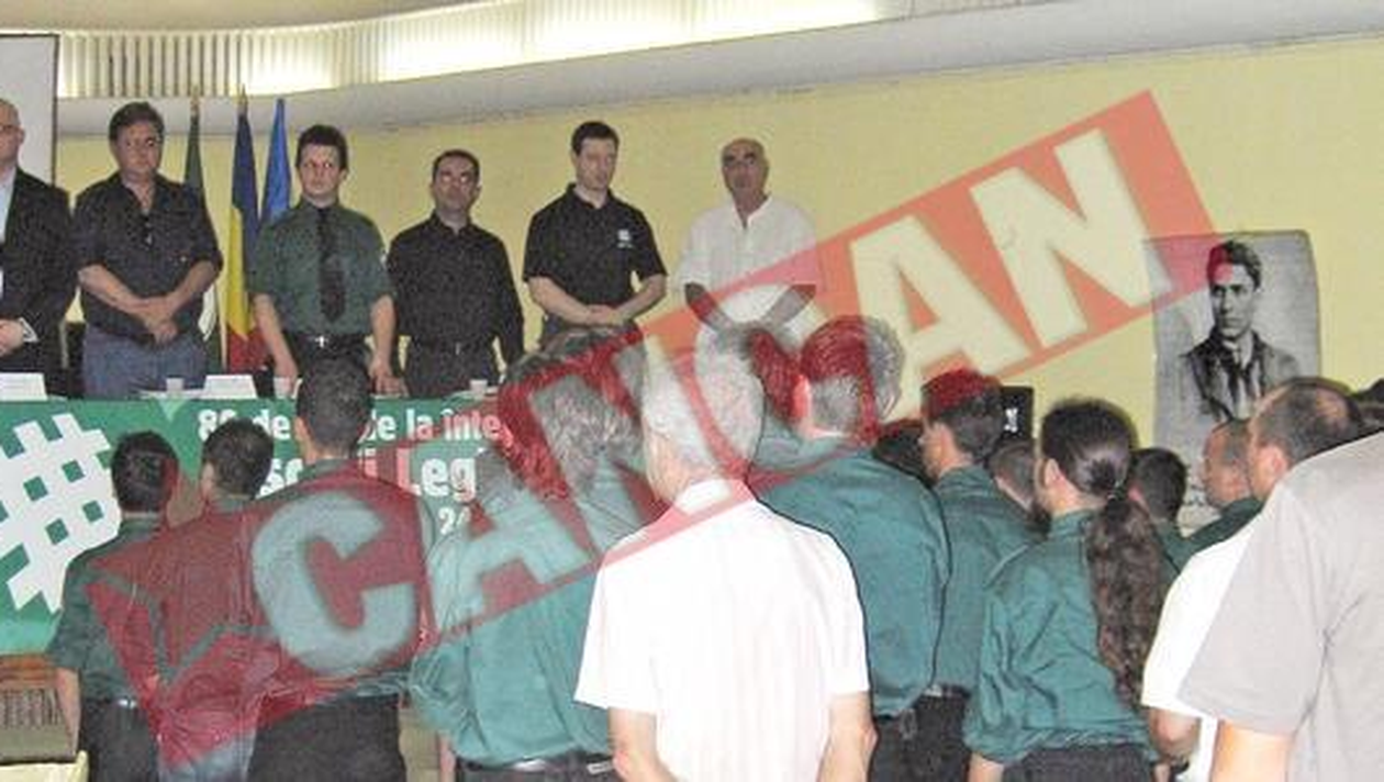 De pe scena toti cei prezenti sunt rugati sa se ridice pentru a spune Tatal Nostru. In cor, sala indeplineste rugamintea. Urmeaza apelul. Individul de pe scena spune: „Capitan Zelea Codreanu”, iar sala raspunde tare „Prezent”, „Comandant Horia Sima” ? „Prezent” etc. etc. etc. Cand multi se pregateau sa se aseze, din boxe rasuna un cantec legionar, moment in care toti iau pozitia de drepti si canta dupa melodie. Mult prea entuziasmat, un batranel intinde bratul drept spre cer, dar il lasa repede jos la insistentele unui tanar in camasa verde care ii sopteste ceva la ureche. Urmeaza discursurile invitatilor din Franta, Grecia, Spania si Germania. Mai retrasi, doi tineri se amuza: „Punem pariu ca pot sa-ti ghicesc care dintre aia de la masa este neamtul?”, spune unul dintre ei, uitandu-se fix spre un individ urias, chel si foarte serios de pe scena. Grecul George Dimitroulias spune ca: „Din batalii se va naste omul nou, care ne va aduce victoria finala.” Cuvintele sale il emotioneaza atat de tare pe un batranel din apropiere, incat adoarme imediat si se trezeste abia cand urmatorul invitat isi incheie discursul cu „Vive la Roumanie, vive la France”. Apoi ia cuvantul spaniolul Felipe Perez, care la sfarsit, pe neasteptate, spune intr-o romana aproximativa: „Traiasca Romania!”, apoi saluta sala cu bratul drept intins. Exact in acelasi moment tatal si fiul ii raspund la salut. Urmeaza minute intregi de aplauze. Ultimul dintre invitatii straini care a luat cuvantul a fost neamtul Jens Puhse, vicepresedintele NPD Germania. In intreaga sala rasuna vocea puternica a neamtului: „Meine kamaraden und kameradinen?” Tinerii se inflacareaza, iar batranii asculta atenti si emotionati un discurs puternic, nationalist si viu, asemanator cu cel al unei figuri istorice, foarte cunoscuta lumii intregi. Dupa discurs, un sfert dintre cei prezenti pleaca, fara a mai astepta cuvintele lui Ion Coja, presedintele Ligii Pentru Combaterea Antiromanismului si ale lui Tudor Ionescu, presedintele Noii Drepte. „Din batalii se va naste omul nou, care ne va aduce victoria finala.” George Dimitroulias