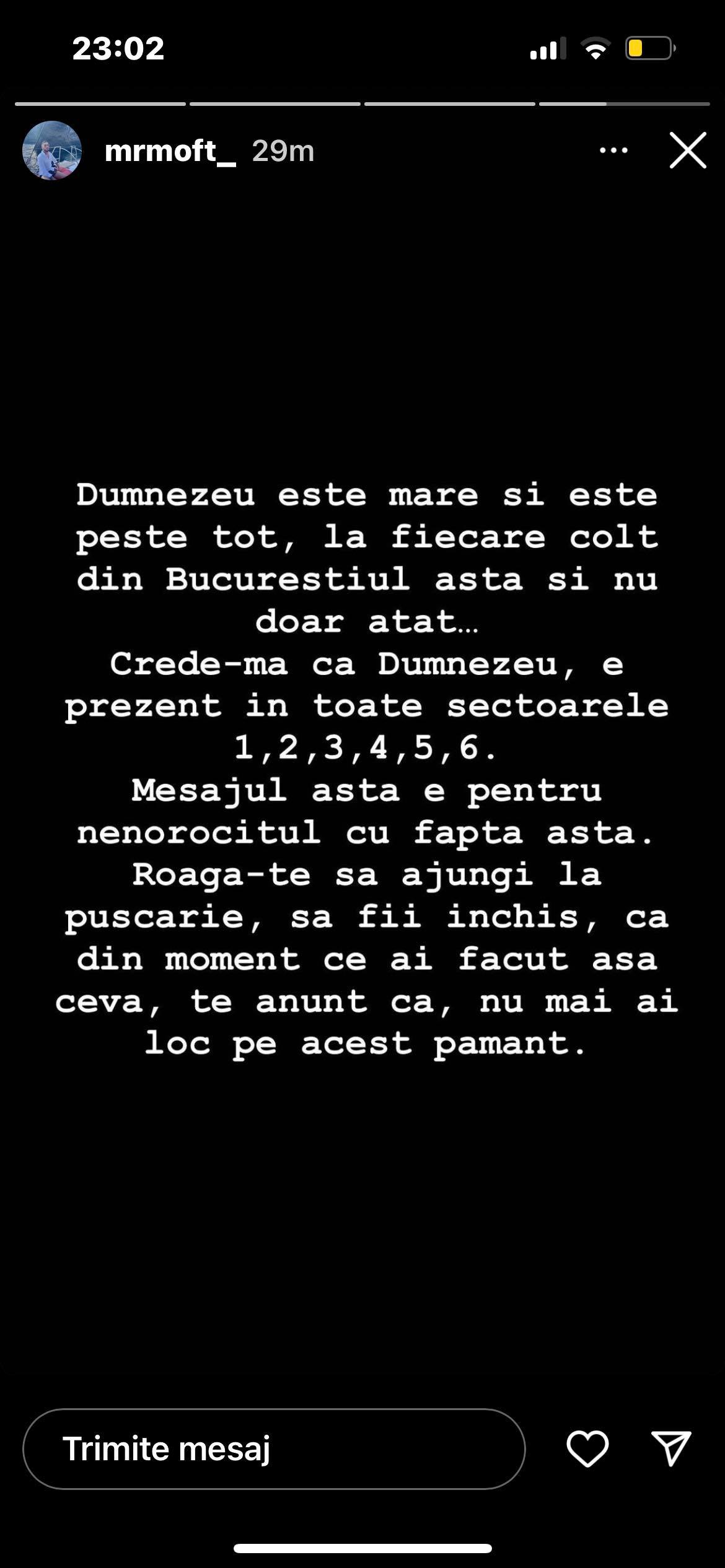 „Dumnezeu este mare şi este peste tot, la fiecare colţ din Bucureştiul ăsta şi nu doar atât… Crede-mă că Dumnezeu, e prezent în toate sectoarele 1,2,3,4,5,6. Mesajul ăsta e pentru nenorocitul cu fapta asta. Roagă-te să ajungi la puşcărie, să fii închis. Că din moment ce ai făcut aşa ceva, te anunţ că, nu mai ai loc pe acest pământ”, a mai transmis Fulgy.