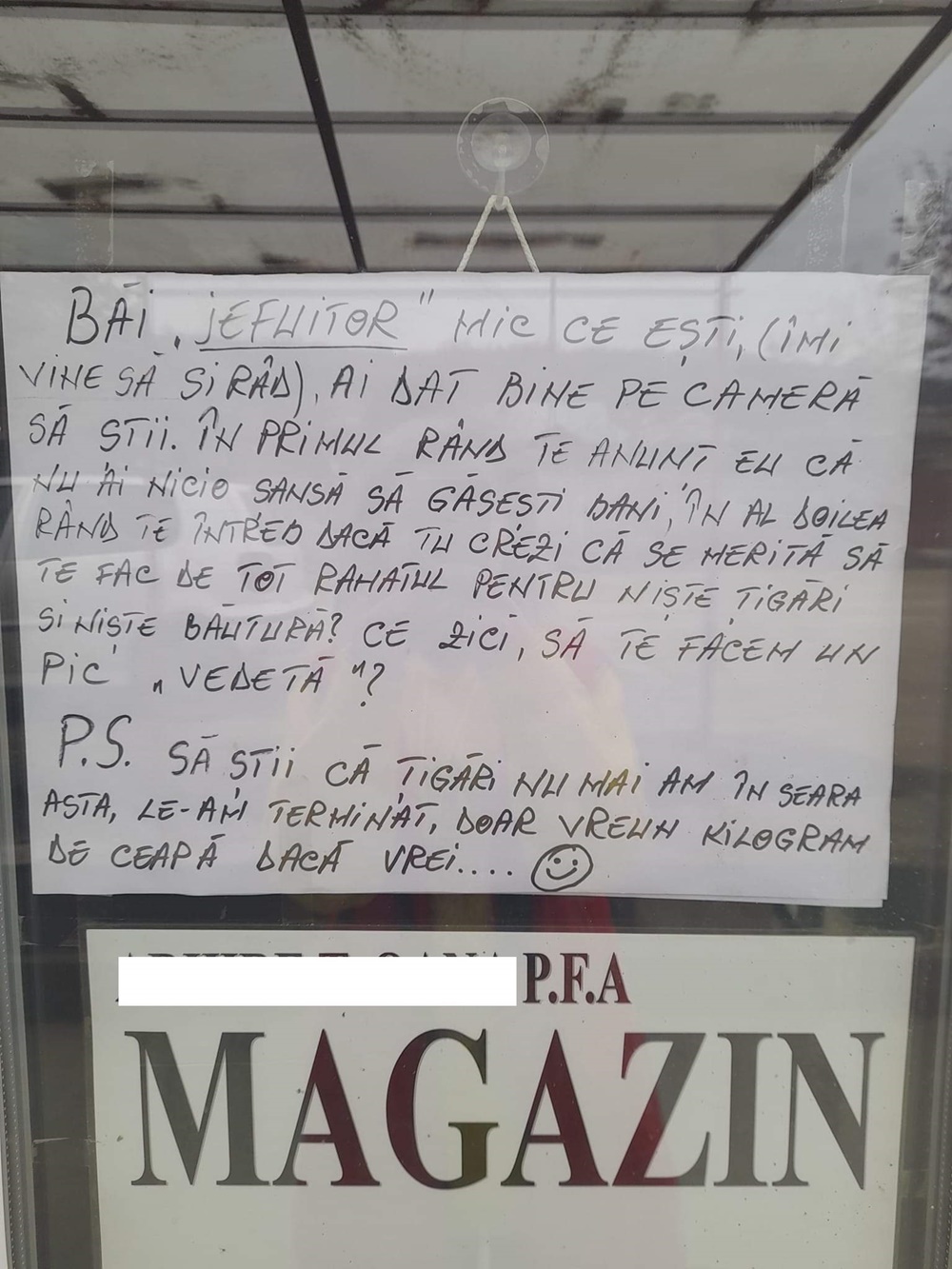 O femeie din Huși, sătulă să-i fie spart magazinul alimentar de către un hoț de „duzină”, i-a adresat acestuia un mesaj, pe care l-a lipit apoi pe geamul spațiului comercial, pentru ca individual să-l citească atunci când atentează din nou la furt.
