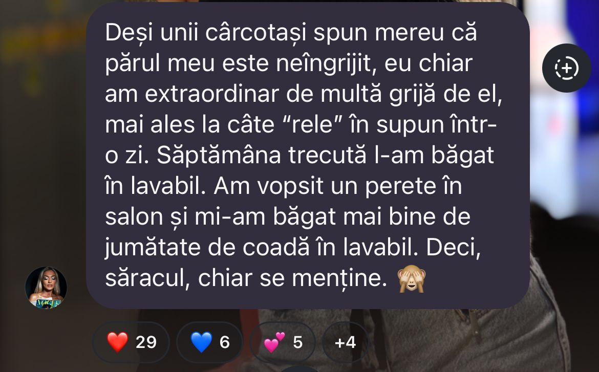 Cricticile acide nu au trecut neobservate. Ella și-a făcut un canal pe Instagram, unde stă de vorbă cu urmăritorii săi. Acolo, a fost întrebată despre problemele pe care le are cu părul. Ei bine, în ciuda imaginilor din cadrul emisiunii, devenite virale pe internet, concurenta a susținut că oferă foarte mare atenție îngrijirii părului.
