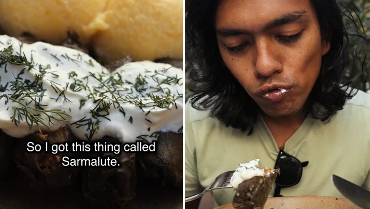 Turistul a mers la un restaurant și a mâncat o porție de sărmăluțe în viță de vie, servite cu smântână, mămăliguță și ardei iute. El s-a filmat în timp ce gusta preparatul și explica internauților ce are în farfurie. La final, a avut o reacție prin care a dat de înțeles că i-a plăcut foarte mult. A zâmbit și a arătat semnul ”like”.