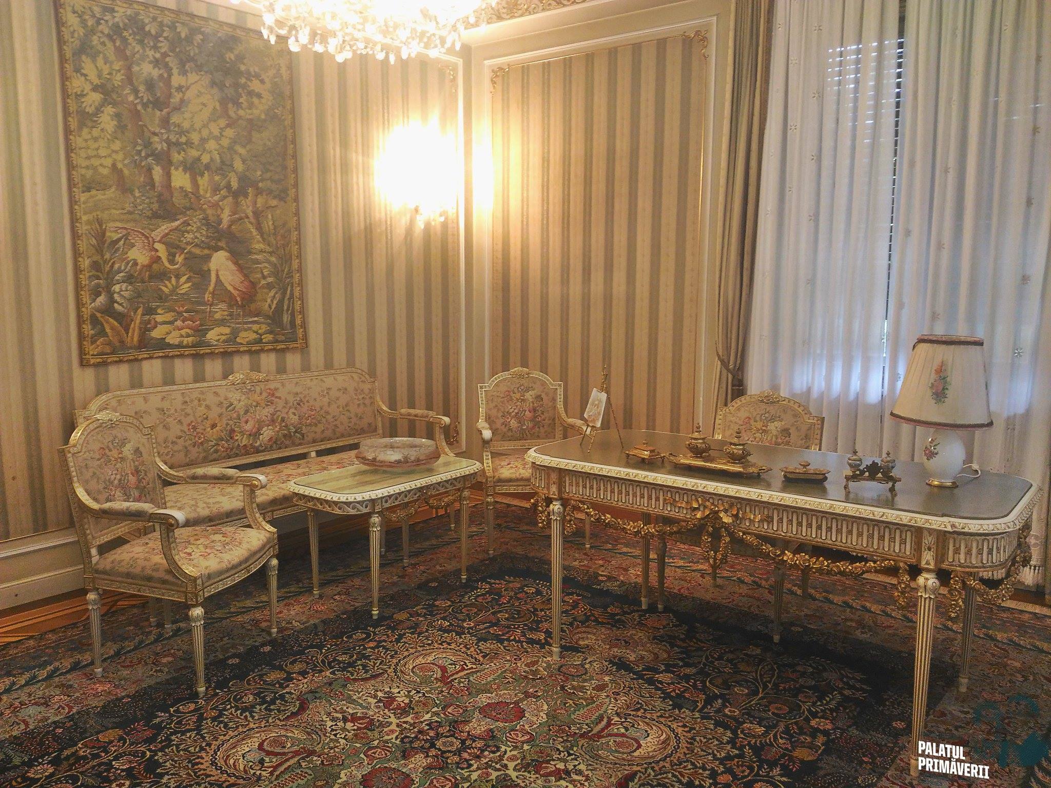 „Apartamentul este compus din salon, cameră de lucru, dormitor și baie. Este o replică a apartamentelor Mariei Antoaneta de la Palatul Versailles din Franța. Tot mobilierul este realizat la Heliade București, decorat în stil Ludovic XVI. În salon remarcăm o tapiserie originală, manufactură franceză, de secolul XIX, alături de 2 vase orientale decorate cu scene de la curtea imperială din Japonia”, se arată pe pagina de facebook a Palatului Primăverii.