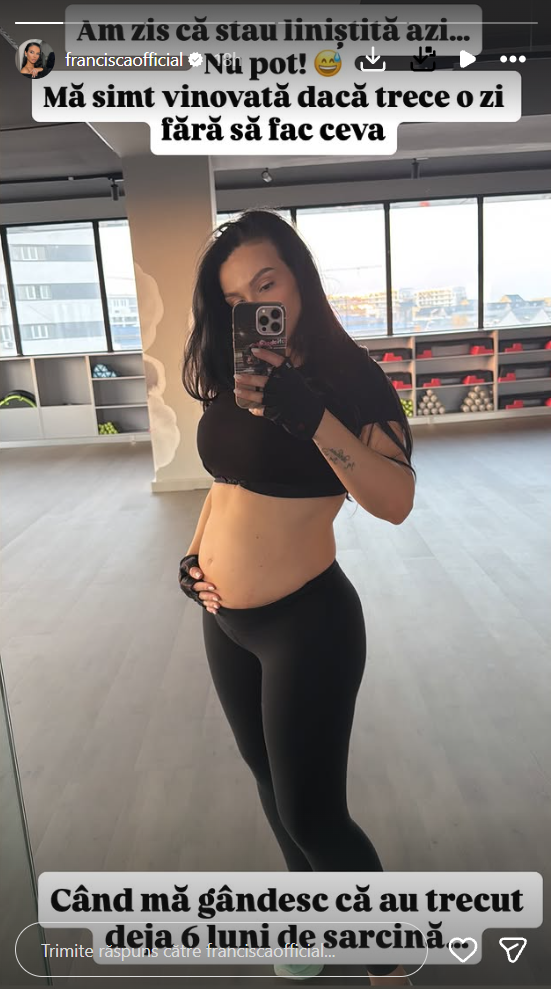 „Am zis că stau liniștită azi… nu pot. Mă simt vinovată dacă trece o zi fără să fac ceva. Când mă gândesc că au trecut deja 6 luni de sarcină… bebelina are deja aproape un kilogram, cu vreo 300 de grame mai mult decât standardul”, a scris Francisca pe Instagram.