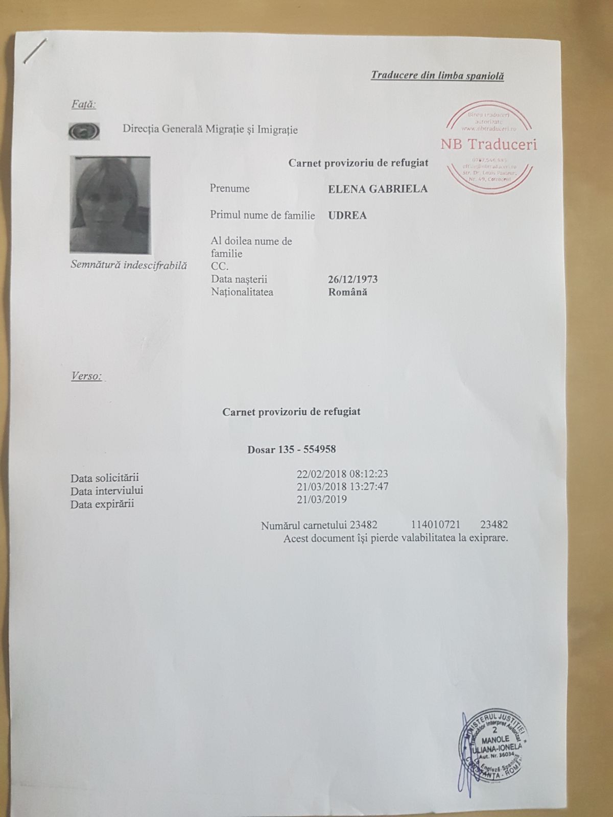 Acesta este documentul care atestă statutul de refugiat al Elenei Udrea