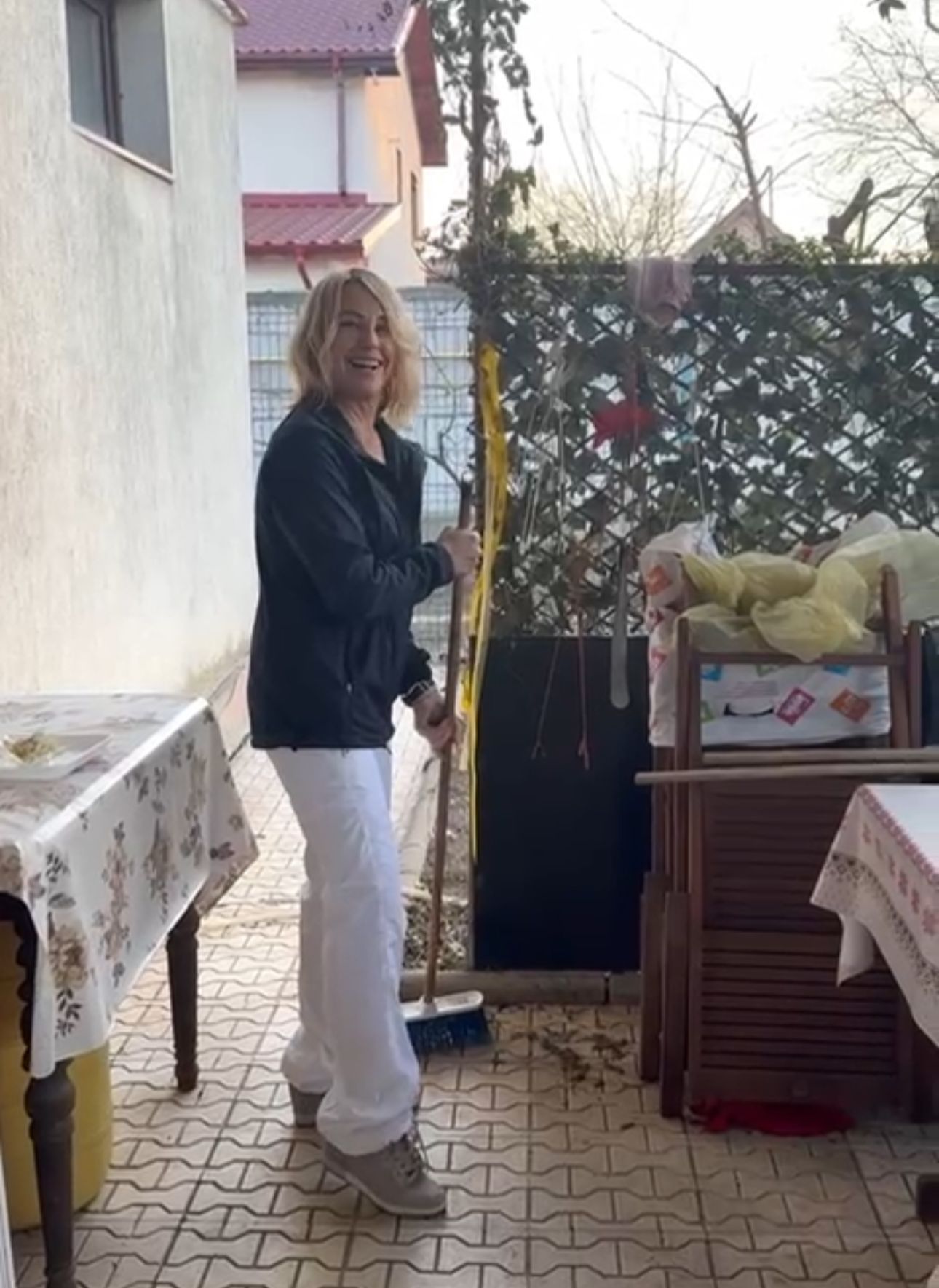 Vizita de acasă nu a fost doar despre nostalgie și bucate alese. Spunem asta pentru că Nadia Comăneci s-a apucat serios de treabă. Fosta gimnastă a luat mătura în mână și a curățat curtea de frunze, iar totodată a pus umărul la pregătirea mesei, ocupându-se de salată.