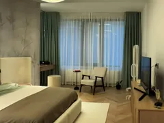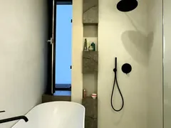 Dormitorul matrimonial este amenajat simplu, dar rafinat, cu un pat dublu, două noptiere, un dulăpior pe care este așezat televizorul, o masă și un fotoliu elegant, creând un colț intim și relaxant. Baia continuă aceeași linie modernă, fiind dotată atât cu cadă albă, cât și cu duș, iar accentele negre ale capetelor de duș adaugă un contrast sofisticat și un aer contemporan întregului spațiu.