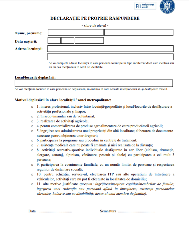 Românii vor trebui să completeze declarația pe propria răspundere dacă părăsesc localitatea. Declarația pe propria răspundere care trebuie completată atunci este părăsită localitatea de domiciliu poate fi descărcată AICI. (CITEȘTE ȘI: VIOREL CATARAMĂ A PRIMIT REZULTATELE TESTULUI COVID-19!)