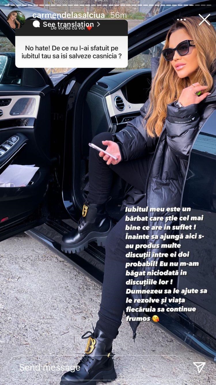 Carmen de la Sălciua s-a îndrăgostit, iar unii dintre urmăritorii ei de pe Instagram o blamează! Actualul partener al artistei nu a divorțat de soția lui, iar fanii o “taxează” ori de câte ori au ocazia. De această dată, au “pus-o la zid” pentru că nu l-ar fi sfătuit pe iubit să-și rezolve problemele din mariaj. Carmen de la Sălciua a dat imediat replica.