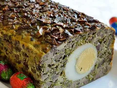 Se unge tava cu unt sau ulei, se toarnă compoziția, se pun ouăle fierte întregi la mijloc, să arate frumos, apoi se bagă la cuptor. Important este să nu treacă mai mult de 140 de grade și se lasă în jur de 1 oră și zece minute, depinde foarte mult de tava folosită.