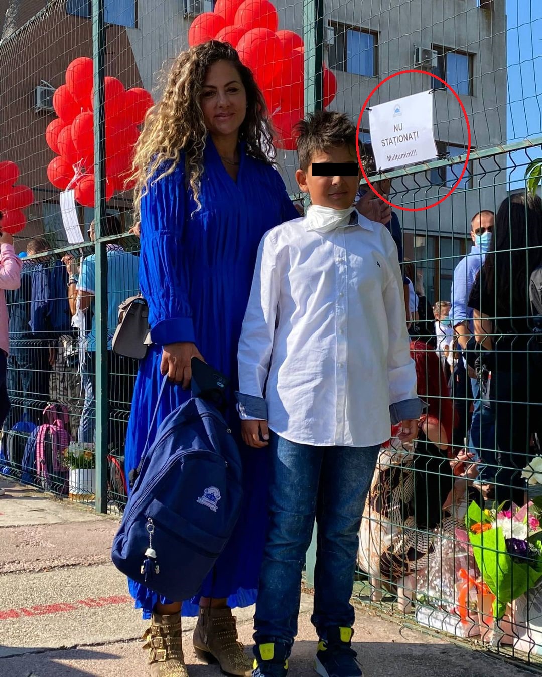 Însă, din neatenţie Oana Turcu s-a fotografiat într-un loc interzis. Oana Turcu și fiul său s-au oprit pentru poză chiar în dreptul gardului școlii, acolo unde staționarea era interzisă! Acest detaliu a fost observat imediat de internauţi.