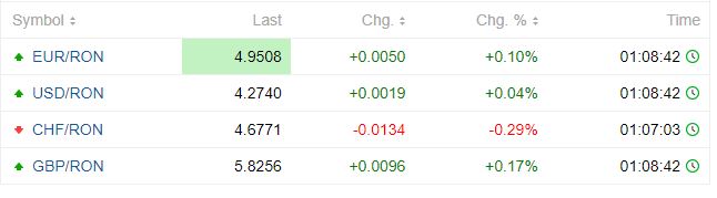 Astfel, 1 euro este cotat la 4.9508 lei, într-o ușoară creștere față de ziua de mați, când valora 4.9487 lei. De precizat că până la ora 13.00, valoarea lui se poate modifica. De asemenea, dolarul se află într-o creștere față de ziua de marți.