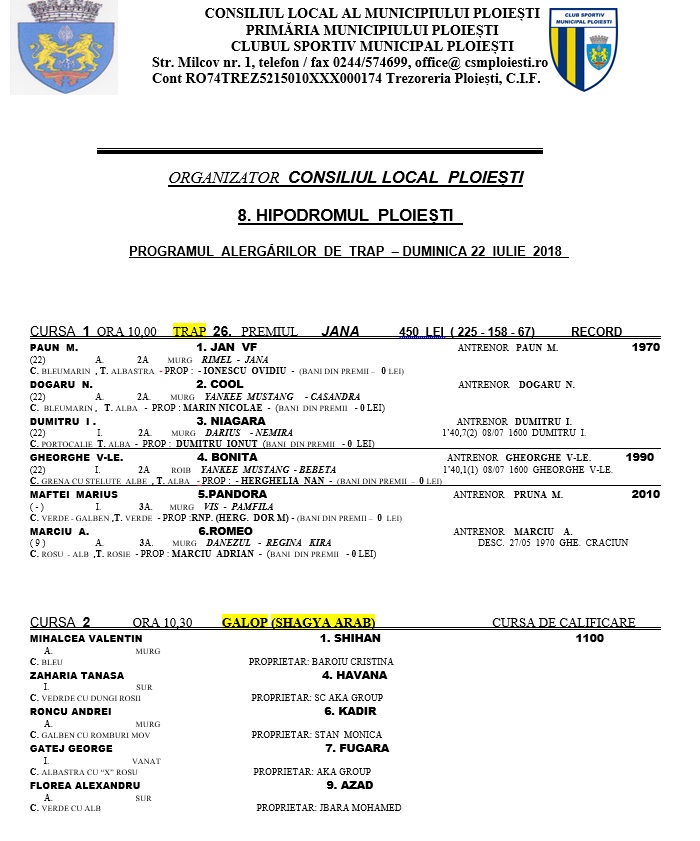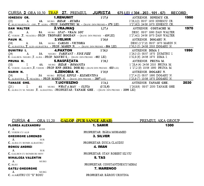 Cursele încep la orele 10.00 şi se vor încheia la orele 14.00 odată cu ultima festivitate de premiere.