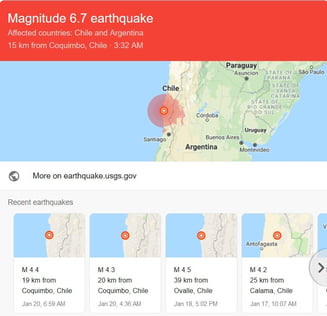 Un cutremur cu magnitudinea de 6,7 grade pe scara Richter s-a produs sâmbătă seara în Chile, fiind resimțit în centrul și nordul țării și provocând pagube materiale, au anunțat reprezentanții Institutului American de Geofizică (USGS), citați de Reuters. Seismul s-a produs sâmbătă, la ora locală 22:32 (duminică, 3:32, ora României) la o adâncime de 53 de kilometri. Epicentrul a fost înregistrat la aproximativ 15 kilometri de orașul Coquimbo.