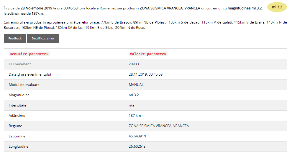 În ziua de 28/11/2019, la ora 00:45:53 (ora României), s-a produs în zona seismică Vrancea – județul Vrancea – un cutremur cu magnitudinea 3.2 pe scara Richter, la adâncimea de 136 km.