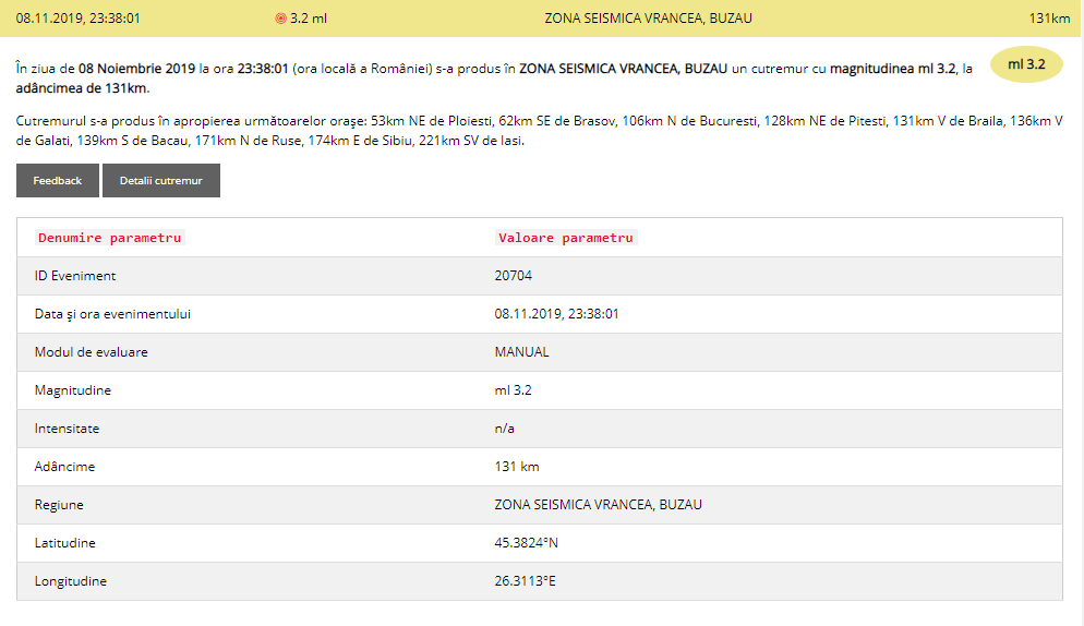 În ziua de 08/11/2019 la ora 23:38:01 (ora României) s-a produs în zona seismică Vrancea, județul Buzău, un cutremur cu magnitudinea 3.2 pe scară Richter, la adâncimea de 131 km.