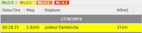 În ziua de 27/08/2019 la ora 00:28:35 (ora României) s-a produs în zona seismică Făgăraș-Câmpulung, județul Dâmbovița, un cutremur cu magnitudinea 2.8 pe scara Richter, la adâncimea de 31km.