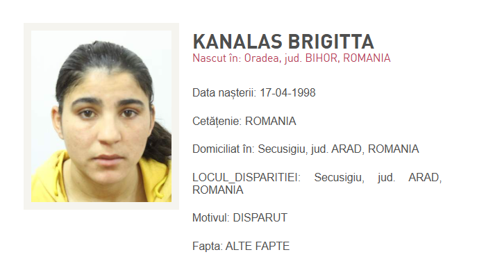 Kanalas Brigitta a plecat de acasă din comuna Secusigiu, județul Arad, marți, 11 noiembrie 2025, iar de atunci nimeni nu mai știe nimic de ea. Oamenii legii au fost sesizați cu privire la dispariția sa, după ce familia nu a mai reușit să o contacteze. Orice persoană care poate oferi informații ce pot conduce la depistarea tinerei este rugat să sune de urgență la numărul Unic 112 sau să se prezinte la cea mai apropiată unitate de poliție.
