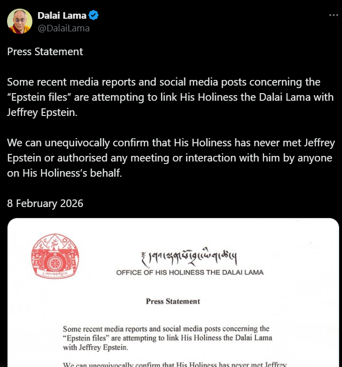 Într-o postare pe platforma de socializare „X”, Dalai Lama a emis un comunicat oficial în care neagă orice implicare și asociere cu Jeffrey Epstein: „Unele relatări recente din mass-media și postări pe rețelele sociale referitoare la dosarele Epstein încearcă să-l lege pe Sanctitatea sa Dalai Lama de Jeffrey Epstein. Putem confirma fără echivoc că Sanctitatea Sa nu l-a întâlnit niciodată pe Jeffrey Epstein și nici nu a autorizat vreo întâlnire sau interacțiune cu el din partea cuiva în numele Sanctității Sale.”
