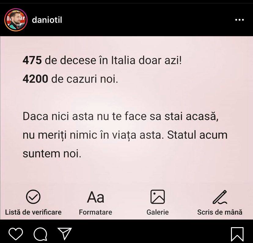 Unul dintre cei care a luat atitudine în fața acestei situații este Dani Oțil. Vedeta a postat un mesaj pe pagina sa de Instagram, iar ideea este una singură. ”Nu meriți nimic” dacă – nici după ce vezi, spre exemplu, câți oameni au murit ieri în Italia – ”nu stai acasă”.