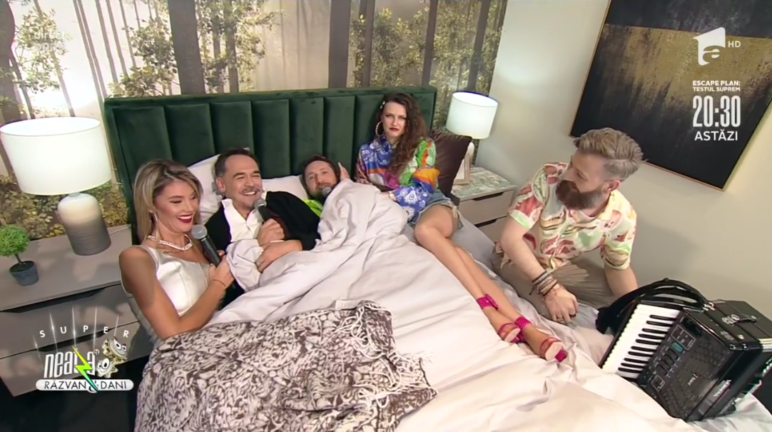 În ediția de vineri, 14 mai, matinalii s-au mutat în ”casă nouă”. Răzvan Simion, Dani Oțil, Ramona Olaru și Florin Ristei au filmat emisiunea într-un showroom de mobilă din Capitală. La un moment dat, spre amuzamentul telespectatorilor, dar și a invitaților, Răzvan, Dani și Ramona și-au tras sufletul pe un pat imens.