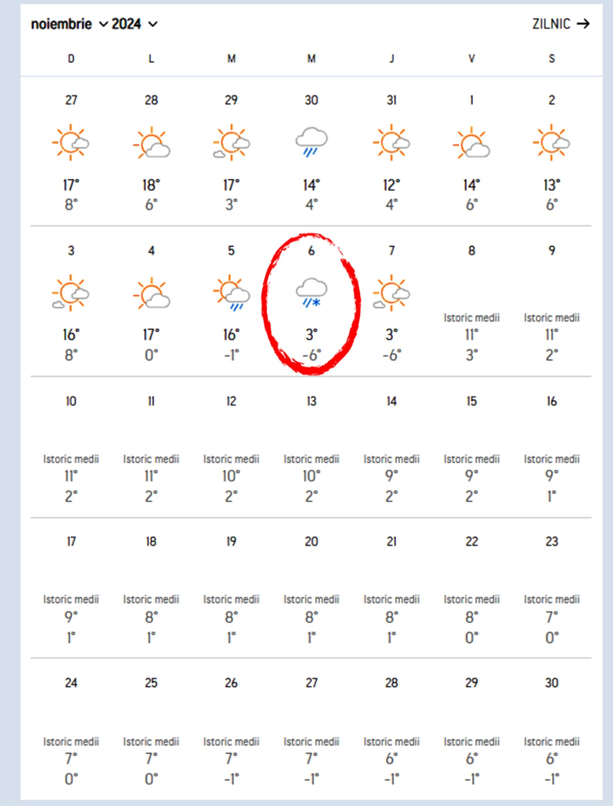 Potrivit previziunilor emise de Accuweather, primele ninsori ar putea să apară în București în prima jumătate a lunii noiembrie, începând cu data de 6 noiembrie. Cu toate acestea, zăpada mai consistentă și temperaturile negative persistente sunt așteptate la finalul lunii, în jurul datei de 25 noiembrie. Meteorologii avertizează că temperaturile vor scădea brusc, marcând un început devreme al iernii în acest an.