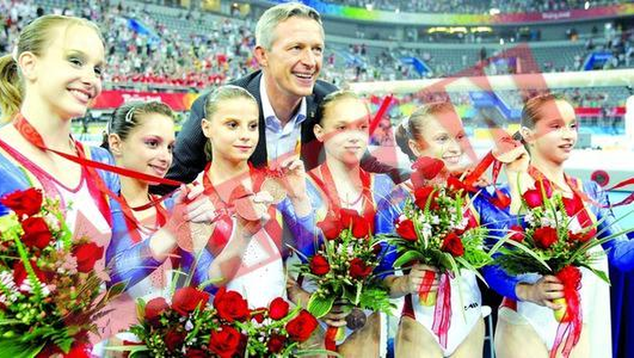 INIMOASE. Micutele gimnaste pozeaza fericite sub aripile protectoare ale sefului COSR, Octavian Morariu Continuitate. Lasand deoparte conglomeratul numit URSS, Romania e singura tara care a ramas de peste trei decenii in fruntea ierarhiei celor cinci cercuri George-Mihail Parvan Pentru cei care erau obisnuiti sa trateze segmentul feminin al gimnasticii romanesti drept „closca cu puii de aur” e momentul sa deschida ochii si sa revina la realitate. China, SUA si Rusia au potential uman, rezervoare de talente incomensurabil mai mari decat noi. Pentru echipa Romaniei, formata din Sandra Izbasa, Steliana Nistor, Gabriela Dragoi, Anamaria Tamarjan, Andreea Acatrinei si Andreea Grigore, cucerirea medaliilor de bronz a fost o reala performanta. China si SUA au fost net superioare, aceeasi diferenta existand, nota bene, si-ntre echipa Romaniei si cea a Rusiei. Felicitand sportivele si colectivul de antrenori condus de Nicolae Forminte, sa amintim ca Romania n-a avut o echipa normala la competitiile majore din ultimii doi ani. Urmeaza concursurile pe aparate, unde Sandra Izbasa are sanse mari la paralele, iar Marian Dragulescu la sarituri si la sol. Posibile si atat de dorite trei medalii de aur.