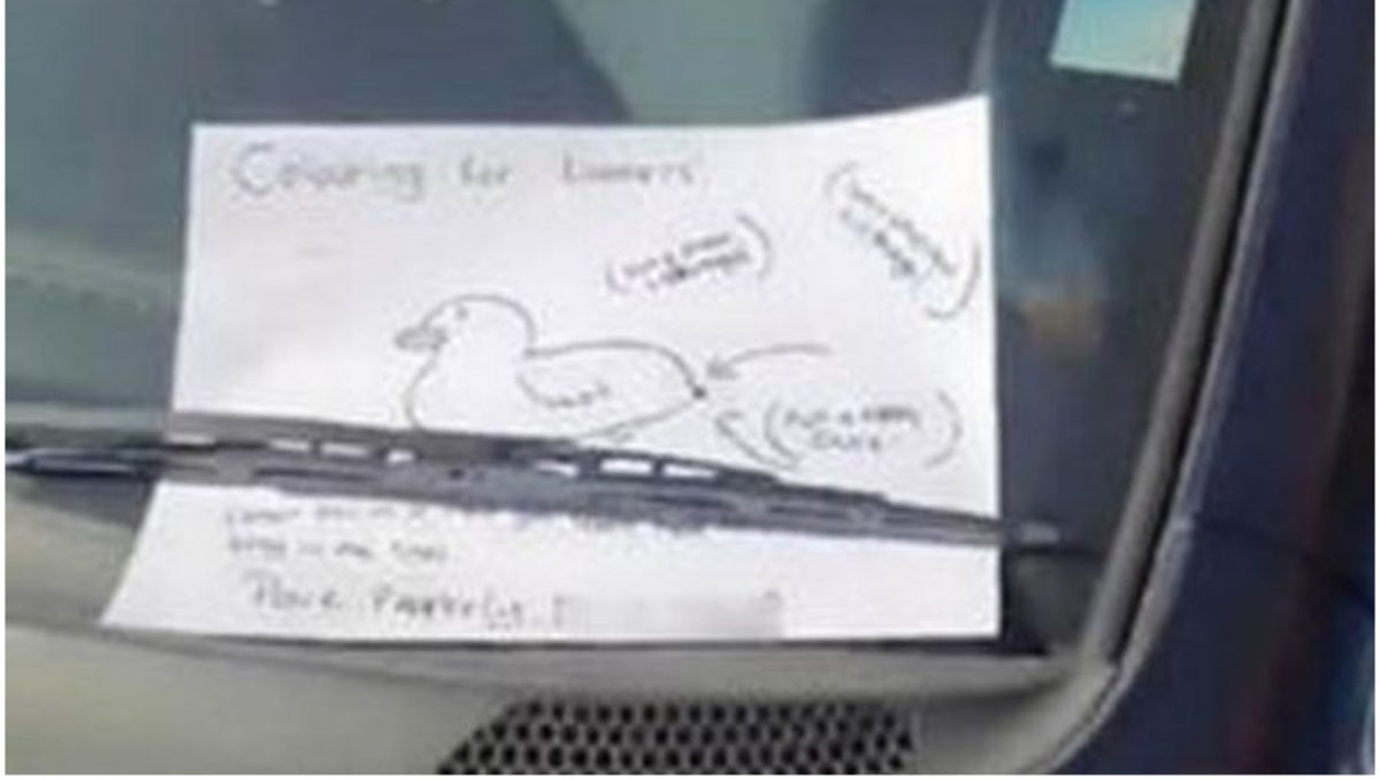 Un trecător a lăsat în geamul unui șofer egoist un bilețel cam obraznic. Bilețelul scris de mână, lăsat în geamul mașinii Toyota Yaris, era intitulat „desene pentru copii” și includea și schița unei rățuște.