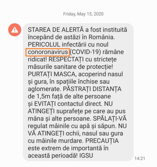 Doar că, mesajul a fost taxat imediat de internauți. A apărut un val de ironii și critici, după ce au văzut greșeala din text. Cel care a redactat mesajul a scris ”conoronavirus”, în loc de coronavirus. (CITEȘTE ȘI: CUM ARATĂ DECLARAŢIA CARE TREBUIE COMPLETATĂ ÎN STAREA DE ALERTĂ! RAED ARAFAT A ANUNŢAT CE TREBUIE SĂ TRECEŢI DACĂ IEŞIŢI DIN LOCALITATE)