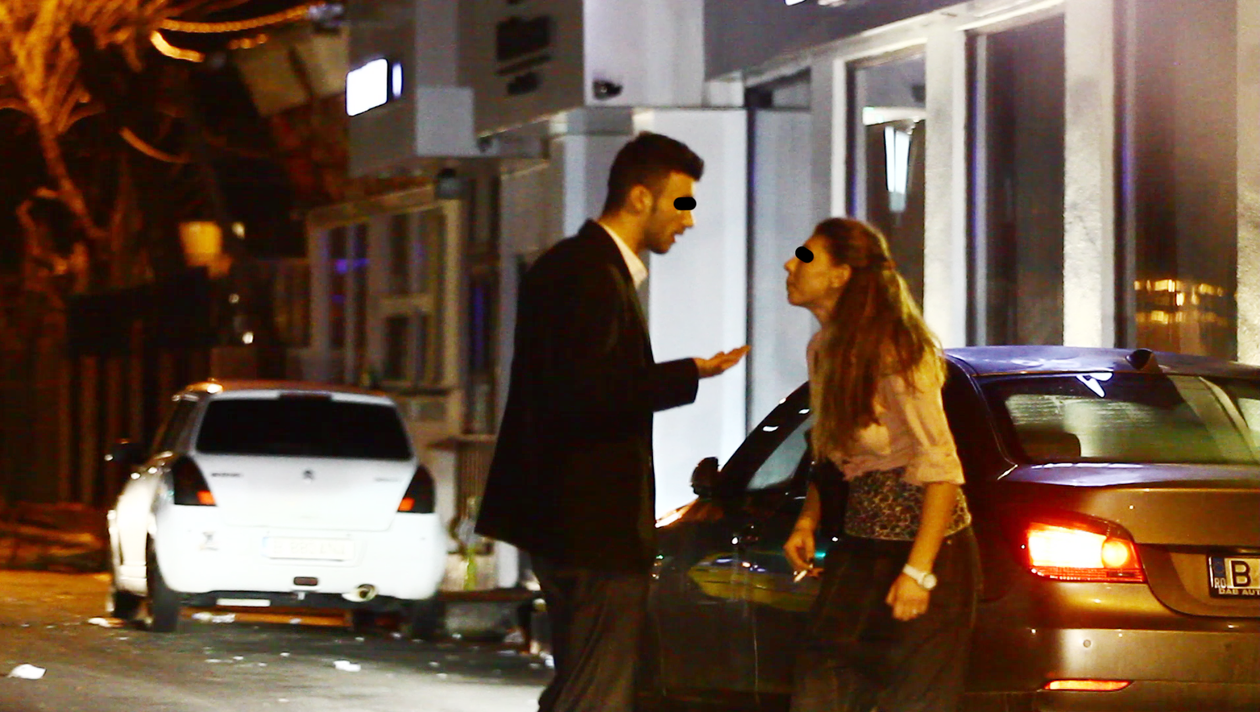 Ii tine o pledoarie domnisoarei blonde care il tine de mana si incearca sa-l convinga ca nu ia cele mai bune decizii sub influenta alcoolului. Degeaba! Barbatul nu cedeaza si o trage intr-o parte, intr-un loc mai dosit, si o mustruluieste minute in sir.