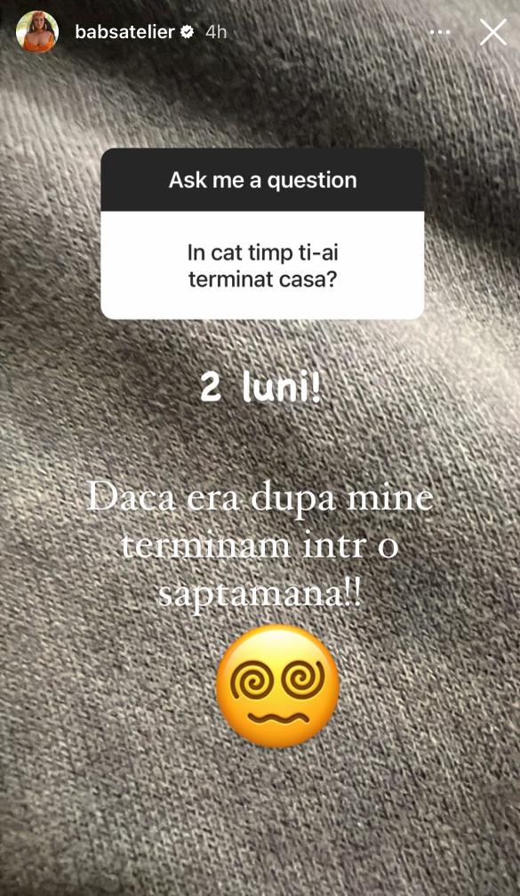 Printre întrebările care i-au fost agresate, Claudia Iosif a răspuns la următoarea: „În cât timp ți-ai terminat casa?”. Fără să stea pe gânduri, bruneta a scris: „Două luni. Dacă era după mine, terminam într-o săptămână!”.