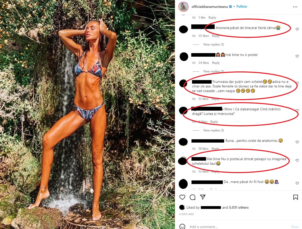 „Frumoasă, dar puțin cam schelet. Adică nu e chiar OK așa. Toate femeile își doresc să fie slabe, dar la tine deja se văd coastele …cam nașpa”, este doar unul dintre multele comentarii malițioase de la postarea vedetei.