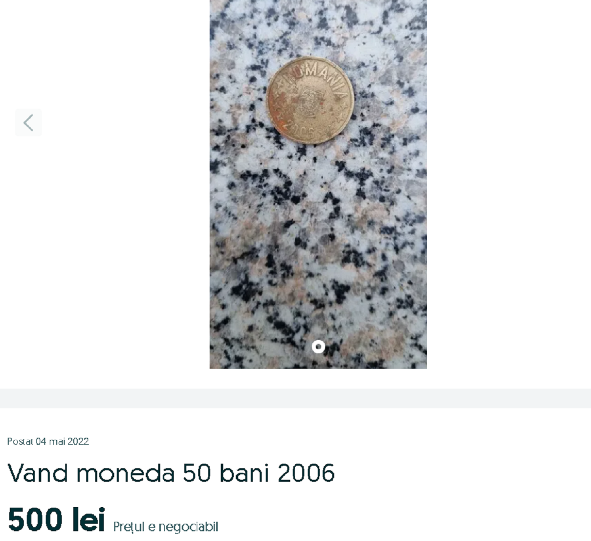 Astfel, un utilizator al paltformei a publicat un anunț în care vinde o monedă de 50 de bani din 2006 cu 500 de lei.