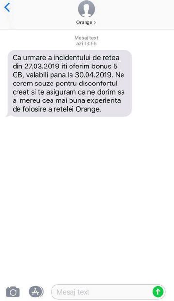„Ca urmare a incidentului de reţea din 27.03.2019 îţi oferim bonus 5 GB, valabili până la 30.04.2019. Ne cerem scuze pentru disconfortul creat şi te asigurăm că ne dorim să ai mereu cea mai bună experienţa de folosire a reţelei Orange”, este mesajul transmis de Orange, conform libertatea.ro.