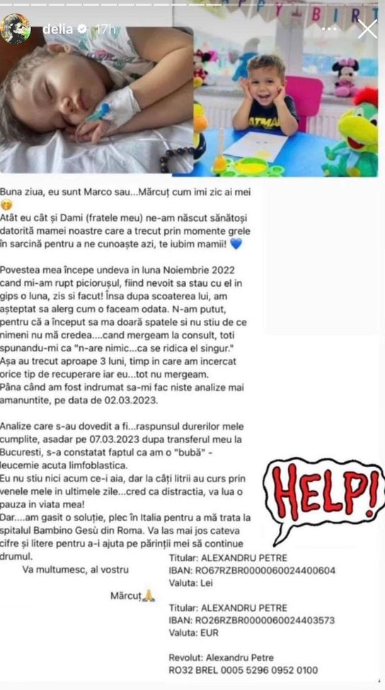Recent, Delia a făcut public cazul unui băiețel care suferă de o boală grea și a cărui vindecare depinde de o sumă de bani. Artista speră că va reuși, cu ajutorul celor care vor să doneze, să strângă banii necesari pentru tratamentul micuțului. Copilul trebuie să ajungă de urgență în Italia, acolo unde poate să primească îngrijiri care să îi salveze viața.