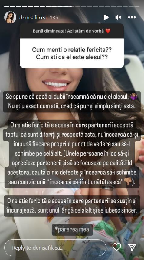 O relație fericită e aceea în care partenerii se susțin și încurajează, sunt unul lângă celălalt și se iubesc sincer. Părerea mea”, a scris Denisa Filcea pe rețelele de socializare.