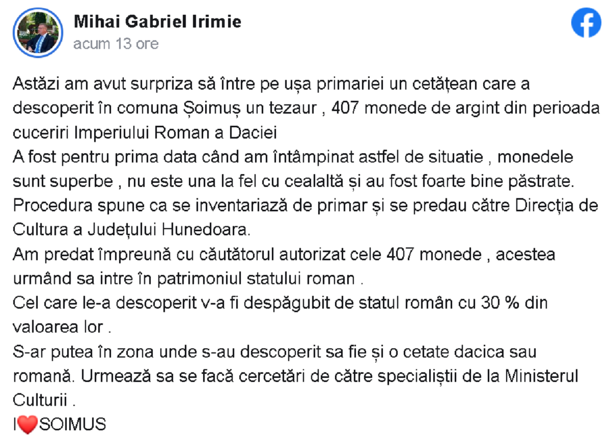 ”Astăzi am avut surpriza să între pe ușa primariei un cetățean care a descoperit în comuna Șoimuș un tezaur, 407 monede de argint din perioada cuceriri Imperiului Roman a Daciei. A fost pentru prima data când am întâmpinat astfel de situație, monedele sunt superbe, nu este una la fel cu cealaltă și au fost foarte bine păstrate.