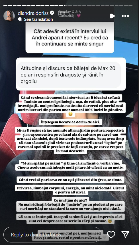 „Când se cheamă oameni la interviuri, ar fi ideal să se facă înainte un control psiholog, așa, de rutină, plus alte investigații… mai profunde, nu e alta, dar cred că merităm să auzim lucruri din partea unor oameni 100% lucizi în gândire. Înțelegem fiecare ce dorim de aici. Mi-ar fi rușine să fac anumite afirmații din postura respectivă și m-aș concentra pe colacul ăla de salvare pe care l-am aruncat căsniciei, după toate cele întâmplate. Nu aș avea timp să stau să ascult și să vizionez podcasturile unei „ispite” pe care mai apoi să le precizez de față cu soția, pe care o respect în mod deosebit”, a scris Diandra, pe Instagram.