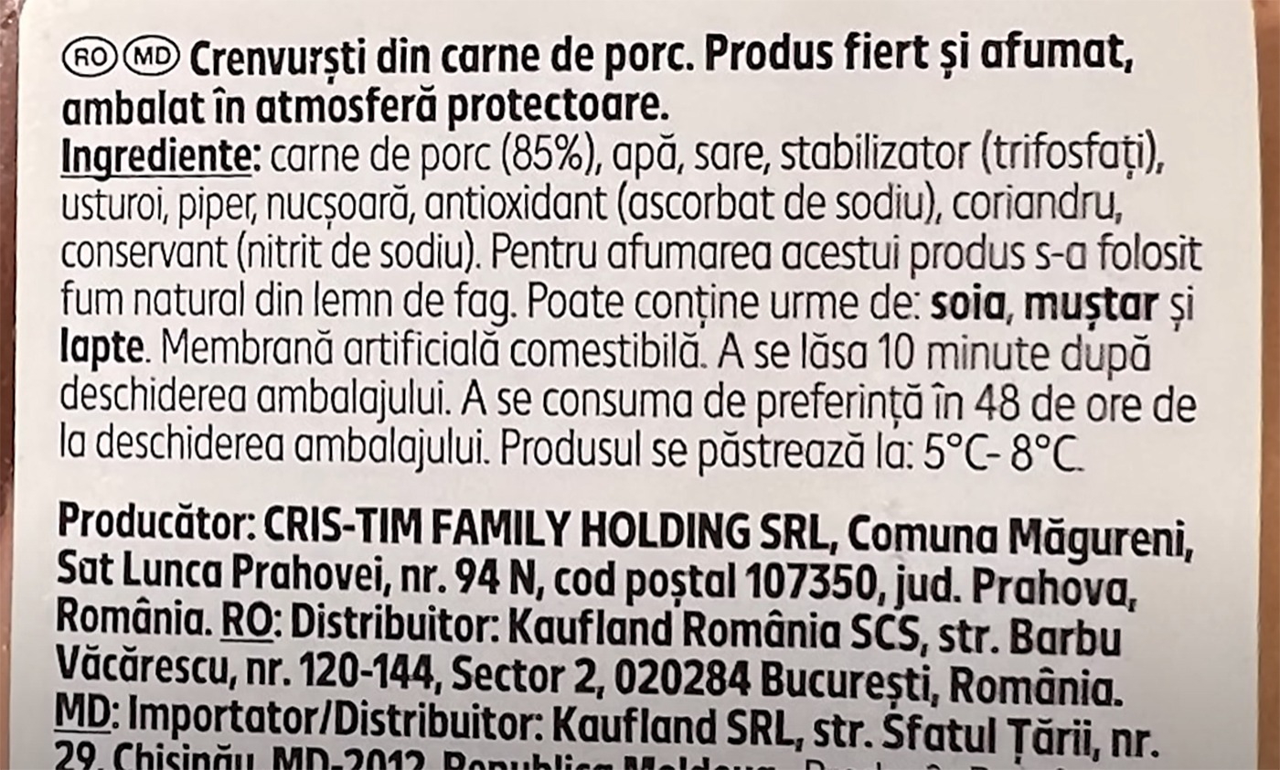 Crenvurști din carne de porc – fierți și afumați. Producător Cris-Tim Family Holding, distribuitor Kaufland România. Pentru afumarea acestui produs s-a folosit fum natural din lemn de fag. Iată care sunt ingredientele de pe ambalaj: